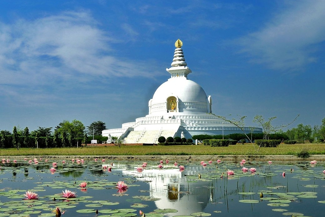 Peace Stupa: The Japan Peace Stupa is situated at the northern end of Lumbini. Built by the Nippon Jon Myohoji of Japan, the 41-m tall edifice is visible from a distance. Four different Buddha statues are set into the stupa's dome to face the four cardinal directions. Sri Lanka, Vietnam, Thailand, and Mongolia are also building temples in Lumbini.(B)