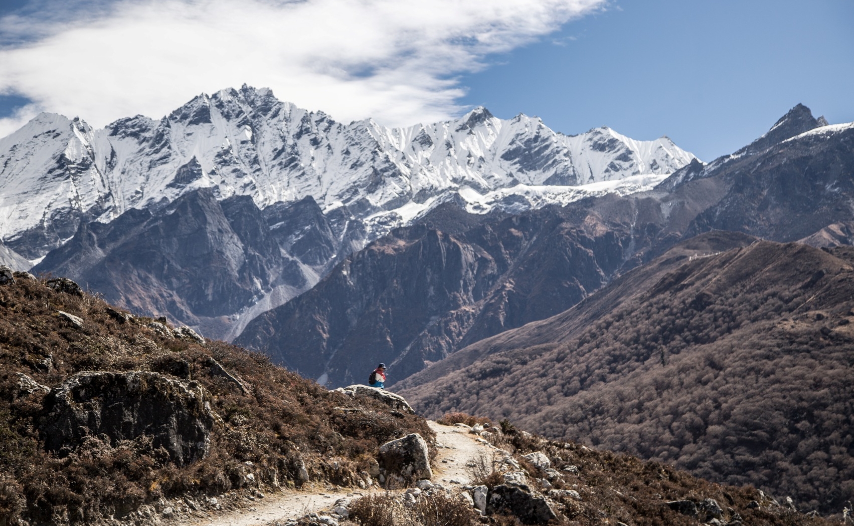 The trail continues to descend from Chisopani on a good, sometimes level path that crosses meadows and fields. You will then descend through Pathi Bhanjyang to reach Gul Bhanjyang. Next, the trail climbs the ridge from Gul Bhanjyang to another pass at 2620m. The meadow provides a good camping spot, then it's downhill to Kutumsang at 2470m, located in a saddle atop the ridge. (B/L/D)